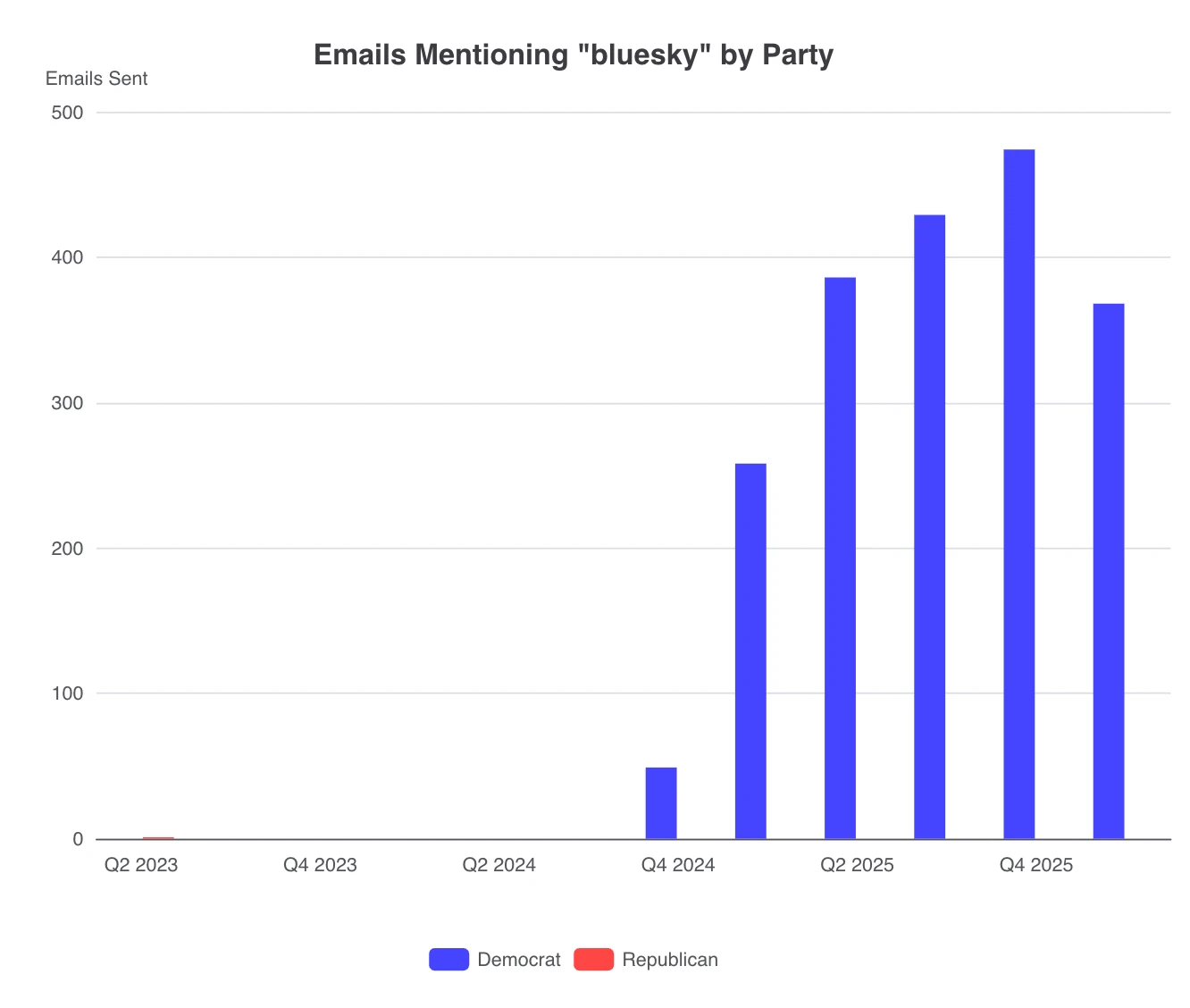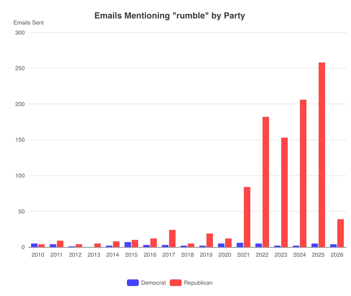 Earlier this week, I showed my Research Methods class something I learned with DCinbox this week: mentions of Bluesky versus Rumble in official congressional e-newsletters (most of my students didn’t really know either platform…a few had heard of Bluesky and told me it was described as “woke Twitter” and none of them had heard of Rumble). Here’s what I showed them:
