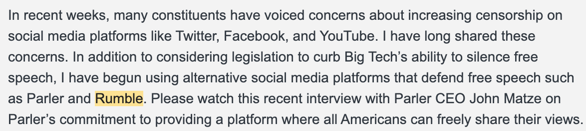 Rumble was founded in 2013 by Chris Pavlovski as a video-sharing platform initially designed to help small creators distribute and monetize their content without relying on traditional media gatekeepers. In 2020 as debates over content moderation intensified across major tech platforms having to do with COVID-19 information, Rumble capitalized on this moment by branding itself around free speech and minimal moderation and in turn became a favorite of congressional Republicans. The first mention of it came from Devin Nunes on Nov 18, 2020 saying,